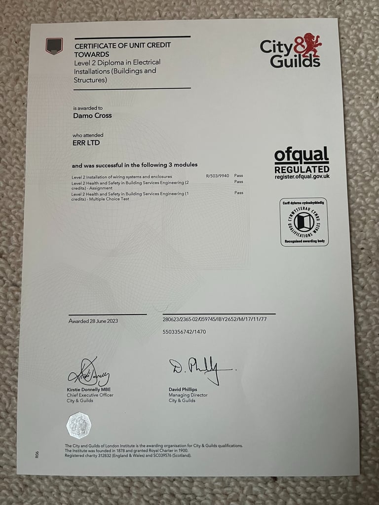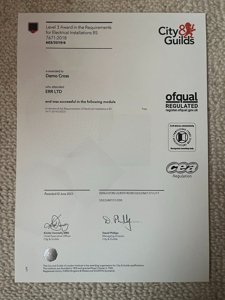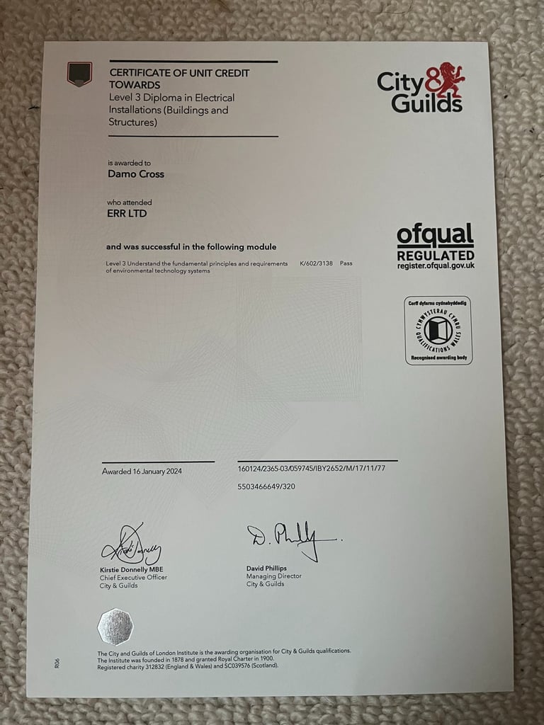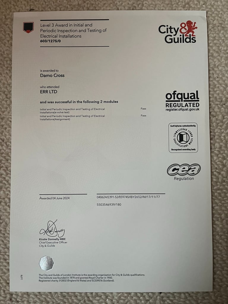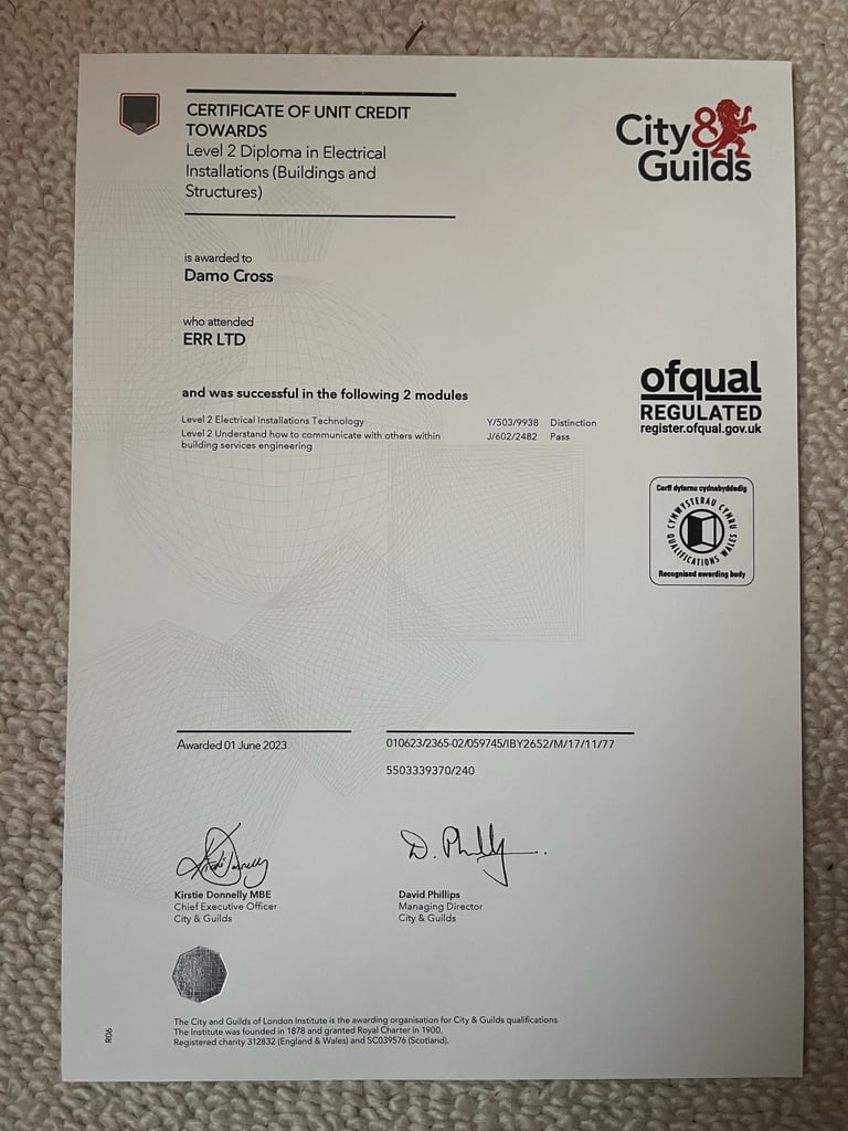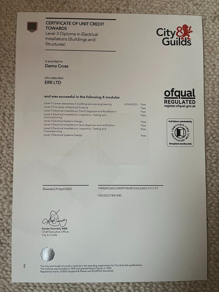 My Level 3 Electrical Installation qualification, is a City & Guilds diploma, an advanced technical focusing on electrical theory, design, fault-finding, and inspection and testing. It covers scientific principles, electrical regulations like BS 7671, safety considerations, and installation design, preparing graduates toward a fully qualified electrician role.
